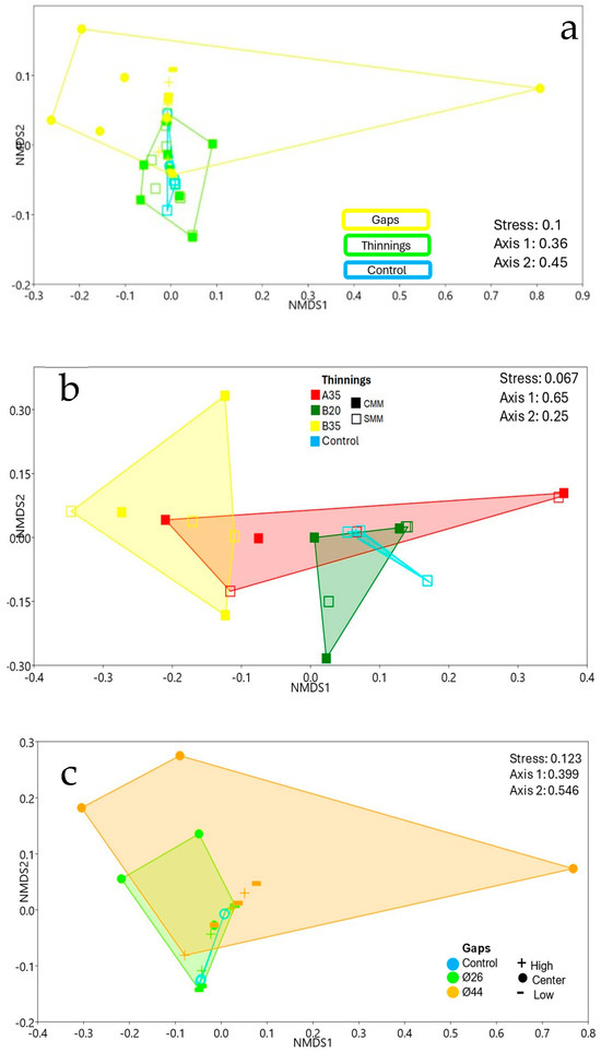 NMDS of fungal communities according to (a) treatments, (b) thinning intensity, and (c) gap diameters.