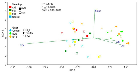 The RDA (Figure 9) showed that much of the fungal communities in gaps were influenced by insolation, altitude, and low ICV, while the thinning communities and controls moved in an average ICV environment.