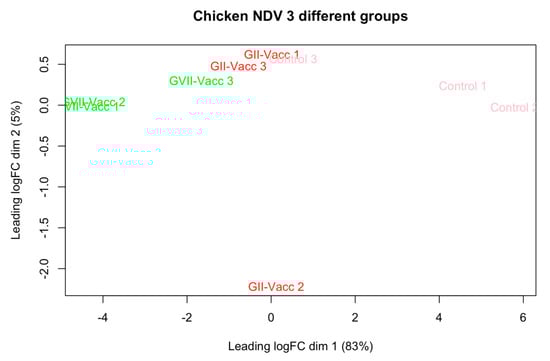 PCA plot for the three experimental groups as per Table 1. The groups are included including vaccinated chickens with NDV-GVII, NDV-GII, and unvaccinated chickens as control groups.