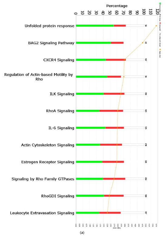 The Unfolded Protein Response (UPR) pathway (Figure 3a) is part of the cellular stress and injury group. This pathway regulated responders to Endoplasmic Reticulum (ER) stress, including stress transducers such as PERK, IRE1, and ATF6. All these transducers were down-regulated (blue color in Figure 3a). PERK is a part of EIF2α and was down-regulated, suppressing the protein that causes apoptosis. XBP-1, a gene downstream of IRE1, was down-regulated. In addition, actin cytoskeleton signaling, regulation of actin-based motility by Rho, and ILK signaling involved in cellular growth, proliferation, and development were down-regulated (not depicted). As part of the intracellular and second messenger group, GTPase signaling family genes such as Rac, Rho, and cdc42 played a dominant role in cellular development pathways in chickens vaccinated with GII-vacc. Moreover, the activities of the family GTPase as the second messenger were down-regulated in the leukocyte extravasation pathway (Figure 3b).