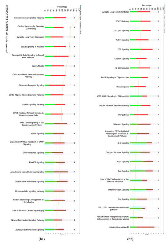 In contrast, the pathways involved in nervous system signaling tended to be up-regulated, specifically the synaptogenesis signaling pathway as neuron communication (Figure 4d). As IPA analysis has shown, this communication between neurons involves three regions: pre-synaptic on the tip of the axon, synaptic cleft, and post-synaptic neuron in the dendritic spine, as shown in Figure 4d. Glutamate, as a neurotransmitter can activate the intracellular signaling pathways such as LTD, LTP, and cAMP pathways in the neuron, reflected with orange shapes in this data set. Altogether, they activated the cAMP-responsive element-binding protein (CREB) as a nuclear transcription factor that triggers gene expression. In addition, some proteins marked with orange colors, such as neuronal adhesion, synaptic spine density, microtubule, and synapse stabilization, were activated in this DEG list (Figure 4d).