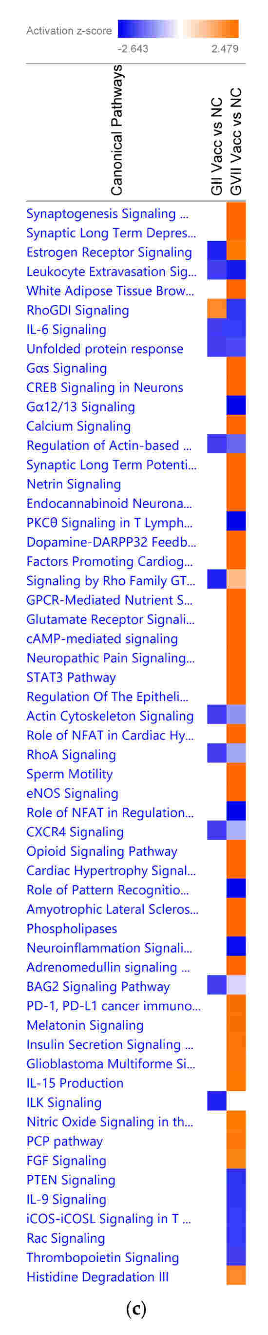 When a False Discovery Rate (FDR) of ≤0.05 and log fold change of ±1 were set as thresholds, only 89 genes from GII-vacc vs. control and 2751 genes from GVII-vacc vs. control were reported as DEGs. Using 2 as an absolute z-score, 12 significantly differentially expressed pathways were identified for GII-vacc vs. control (Figure 2a) and 43 for GVIIvacc vs. control (Figure 2(b1,b2)). Each pathway contained up-and down-regulated genes (Supplementary Table S1).