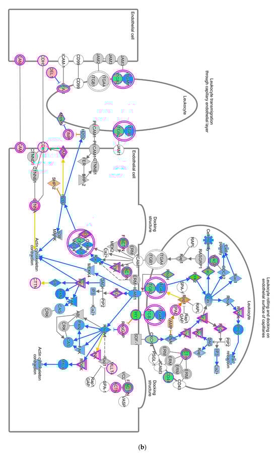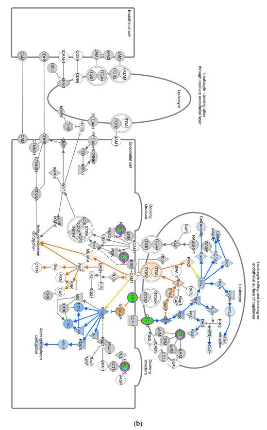 Pathways altered in chickens vaccinated with GII. The pathways are overlaid with the Molecule Activity Predictor (MAP) feature to recognize the unknown molecules. Green and red shapes represent down- and up-regulation. The orange and blue shapes represent predicted molecule activation and inhibition, respectively. (a) Unfolded Protein Response (UPR) pathway. (b) Leukocyte extravasation signaling.