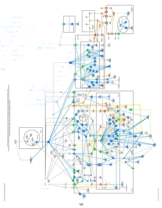 Pathways that correlated with immune system regulation were down-regulated, including the neuroinflammation signaling pathway (Figure 4a), leukocyte extravasation (Figure 4b), and NFAT-regulating immune response (Figure 4c). NF-ƙB (marked with green circles) in microglial cells was a part of neuroinflammation signaling (Figure 4a). The down-regulated NF-ƙB is capable of inhibiting the activities of downstream proteins such as IAP, BCL-2, pro-inflammatory, and anti-apoptotic proteins shown with blue squares. However, the downregulated NF-ƙB can also activate NTF3 in microglia cells, as shown in a pink square (Figure 4a). In the neuroinflammation pathway, IFN γ in splenocytes was downregulated and prevented the activity of downstream proteins such as T cell, CD4+, CD8+ recruitments, and microglia activation that showed with blue shapes (Figure 4a).