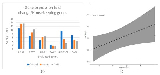 Quantitative PCR was used to validate the RNA-seq results (Table 2). The correlation between qPCR results and RNA sequencing data was high (R2 = 0.83). Amplification efficiency (AE) of all selected genes ranges from 95% to 109% (Supplementary Table S1). In Figure 5a,b, the ΔΔCt value for each group was compared to quantify the expression using log fold change. GAPDH and ACTB were used as reference genes for normalization. The relationship between the expression of the genes from the transcriptome and qPCR was estimated using Pearson correlation.