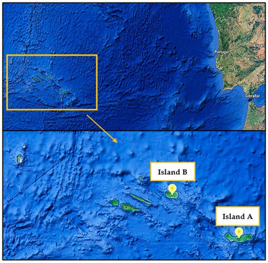 The study took place on two islands of the Azores archipelago, located in the Atlantic Ocean, between September 2019 and January 2020, where a total of 320 samples were collected: 153 on Island A—São Miguel (37.7804° N, 25.4970° W); 167 on Island B—Terceira (38.4315° N, 27.1313° W) (Figure 1). The majority of samples were collected on Terceira Island, given its proximity to the laboratory where the analysis took place. Geographic location is a strong determinant of the climate present on the islands of the archipelago. Therefore, the different islands have different climatic features. Also, within each island, there are climatic asymmetries related to the morphology, geological structure, vegetation and, in some cases, the influence of neighboring islands. Some locations on the islands are recognized for having a well-defined microclimate. Nonetheless, the sample collection took place almost entirely in Cfb locations (Figure 2) distinctive of the general climate classification of the Azores archipelago []. Likewise, the level of precipitation differs across the various islands, being higher on islands in the western group and lower on those in the eastern group. Even so, in general, the climate of the Azores is characterized by high levels of air humidity, mild temperatures, low insolation rates, regular and abundant rainfall, and severe winds. The climate is temperate, with average temperatures of 13 °C in winter and 24 °C in summer [].