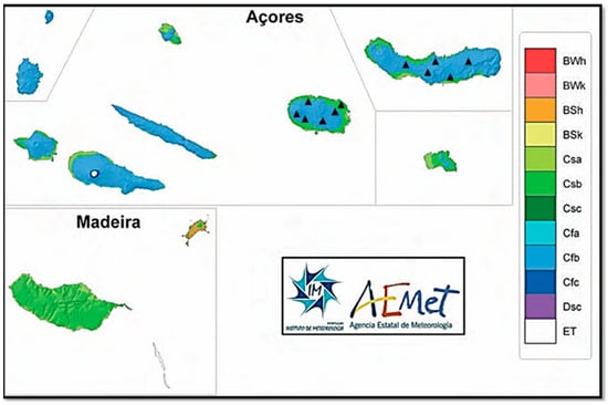 Köppen–Geiger climate classification in the archipelagos of the Azores and Madeira Islands: BWh—hot desert; BWk—cold desert; BSh—hot steppe; BSk—Cold steppe; Csa—temperate with hot and dry summers; Csb—temperate with dry and warm summers; Csc—temperate with dry and cold summers; Cfa—temperate with no dry season and hot summers; Cfb—temperate with no dry season and mild summers; Cfc—temperate with no dry season and cold summers; Dsc—dry summers, subarctic climate; ET—polar tundra [].