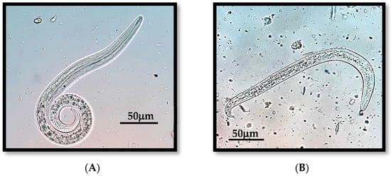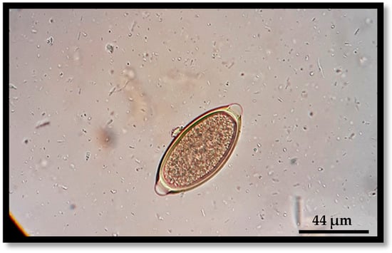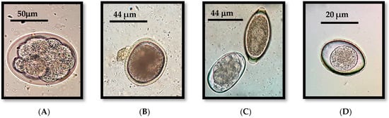 The samples were examined using qualitative coprological methods: the Willis flotation technique with a 33% zinc sulfate (ZnSO4) solution for detection of lethargic larvae and a Sheather’s sugar solution [,,] for the identification of gastrointestinal parasites and a modified Baermann method for the detection of the L1 larvae of pulmonary nematodes []. In addition, a macroscopic examination of all samples was previously performed to assess factors such as consistency, color, existence of blood, mucus and the presence of parasitic forms. The parasites’ identification was based on morphological and morphometric features such as length, width, the posterior and anterior ends of larvae, size, shape, color, shell thickness, surface morphology and content [,,,,,,,].