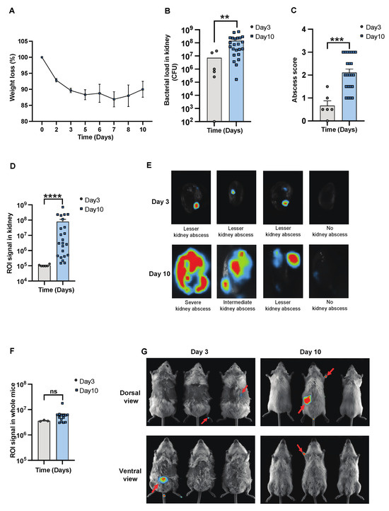 In vivo imaging for assessing the progression and severity of S. aureus sepsis. Parameters were assessed in NMRI mice intravenously [i.v.] inoculated with the S. aureus Newman AH5016 strain [2.4 × 106 colony-forming units [CFU]/mouse]. The animals were euthanized on days 3 [day 3, n = 3] and 10 [day 10, n = 14]. [A] The percentage changes in body weight up to 10 days post-infection. [B] Persistence of S. aureus in kidneys [CFU] and [C] kidney abscess score. [D] Signals were captured and analyzed in terms of region of interest [ROI] from [E] ex vivo kidneys, representative images, and [F] whole mice body ROI signals, respectively, with [G] representative images of whole mice bodies. Arrows indicate bioluminescent signaling. Data for day 10 were pooled from three independent experiments with similar doses. Statistical analyses were performed using the Mann–Whitney U test, with data expressed as the mean ± SEM. ** p < 0.01; *** p < 0.001; **** p < 0.0001; ns = not significant.