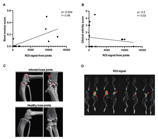 Correlation between the ROI signal from the affected joints and the bone erosion score in mice with hematogenous septic arthritis. NMRI mice intravenously [i.v.] inoculated with the S. aureus Newman AH5016 strain [2.4 × 106 colony-forming units [CFU]/mouse] were monitored until day 10 after infection for clinical signs of arthritis and assessed for bone erosion severity based on micro-computed tomography [μCT]. Correlations were drawn between [A] bone erosion scores based on the extent of bone erosion visualized by μCT. [B] Joint region of interest [ROI] signal and clinical arthritis score assessed clinically. [C] Representative computed tomographic images showing bone destruction in infected knee joints [upper panel] and intact healthy knee joints [lower panel]. Arrows indicate bone erosion. [D] Representative joint images indicated infection in the affected joints. Arrows indicate bioluminescent signaling. Statistical analyses were performed using simple linear regression to determine the p-value and r.