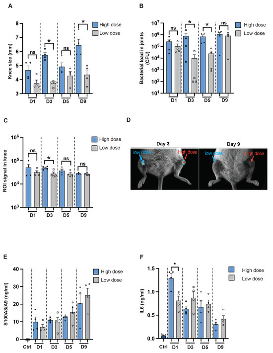 In vivo imaging for assessing infectious progression in a local septic arthritis mouse model. [A] Measurement of knee swelling in millimeters [mm] in NMRI mice [n = 4/group] on days 1, 3, 5, and 9 after intra-articular [i.a.] injection with 20 μL of S. aureus AH5016 strain at a high dose [1.4 × 105 CFU/knee] or low dose [2 × 103 CFU/knee]. [B] Bacterial load in the knee joints at the respective time points, expressed as CFU/joint. [C] Signals from the knee joints were captured using the Newton imaging system and analyzed in terms of region of interest [ROI] for both high- and low-dose groups. [D] Representative images of knee joints (i.a.) injected with high- or low doses of the S. aureus AH5016 strain. Arrows indicate bioluminescent signaling. [E] S100A8/A9 and [F] Interleukin 6 [IL6] levels in knee homogenates on days 1, 3, 5, and 9 post-infection. Statistical analyses were performed using the Mann–Whitney U test, with data expressed as the mean ± SEM. * p < 0.05; ns = not significant.