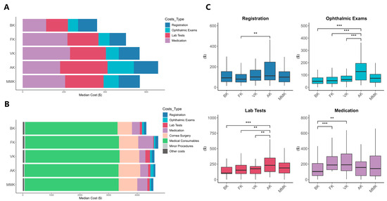 Median costs of patients with different types of keratitis. (A) Among outpatient visits; (B) among inpatient visits; (C) comparative analysis of costs for outpatients with different types of keratitis across different cost types. BK, Bacterial Keratitis; FK, Fungal Keratitis; VK, Viral Keratitis; AK, Acanthamoeba Keratitis; MMK, Mixed Microbial Keratitis. ** represents 0.001 < p < 0.01, *** represents p < 0.001.