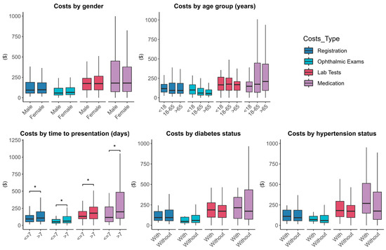 Comparative analysis of different types of costs based on the various influencing factors including gender, age, time to presentation, diabetes, and hypertension. * represents 0.01 < p < 0.05.