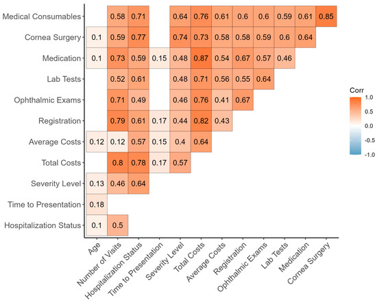 Association measures among demographics, clinical parameters, and cost data of Microbial Keratitis patients (points with p > 0.05 have been excluded) using Pearson’s r, Spearman’s rho, and Cramer’s V.