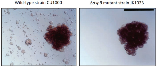 Dispersal of isolated Aggregatibacter actinomycetemcomitans biofilm colonies growing on the surface of polystyrene Petri dishes: (left panel) wild-type strain CU1000; (right panel) ΔdspB mutant strain JK1023. Satellite colonies surrounding the dispersed CU1000 biofilm colony were absent in the JK1023 culture. Photos were taken 3 d after inoculation. Scale bar = 1 mm. Image from [12].