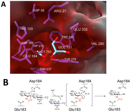 Like all glycoside hydrolase family 20 enzymes, dispersin B adopts a TIM barrel protein fold consisting of eight α-helices and eight parallel β-strands that alternate along the polypeptide backbone (Figure 3). The active site of the enzyme is a large central cavity at the center of the TIM barrel that exhibits a negative electrostatic potential due to the presence of a number of polar acidic residues that are also conserved in other β-hexosaminidases (Figure 4A). Trp216 and Trp330 form the floor of the 12 Å deep substrate-binding pocket where the hexose ring binds. Asp183 and Glu184 are the catalytic residues that are conserved in all glycoside hydrolase family 20 enzymes [26,27,28].