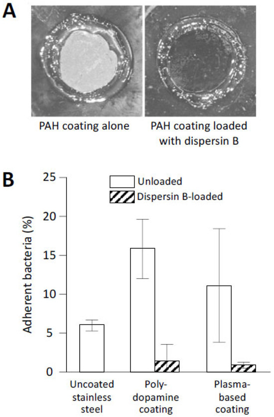 Covalent modification of solid surfaces, such as stainless steel mimicking the surfaces of biomedical implants, enables a convenient and rapid method for creating reactive surface groups using atmospheric plasma technology for the rapid modification of surfaces with protein-binding interlayers [66,68]. In one example, epoxy-rich films were created by introducing glycidyl methacrylate in the plasma, followed by covalent immobilization of dispersin B and a sulfomethoxazole-degrading enzyme (laccase). These coatings resulted in a 79–84% reduction in adherent S. epidermidis bacteria [68]. The atmospheric plasma technique was also used to deposit acrylic-based interlayers containing chemically reactive catechol/quinone groups on metallic surfaces for subsequent immobilization of dispersin B [66]. This biomimetic approach with both solution-adsorbed polydopamine (PDA) and plasma-based interlayers showed high antibiofilm activity against S. epidermidis (Figure 6B).