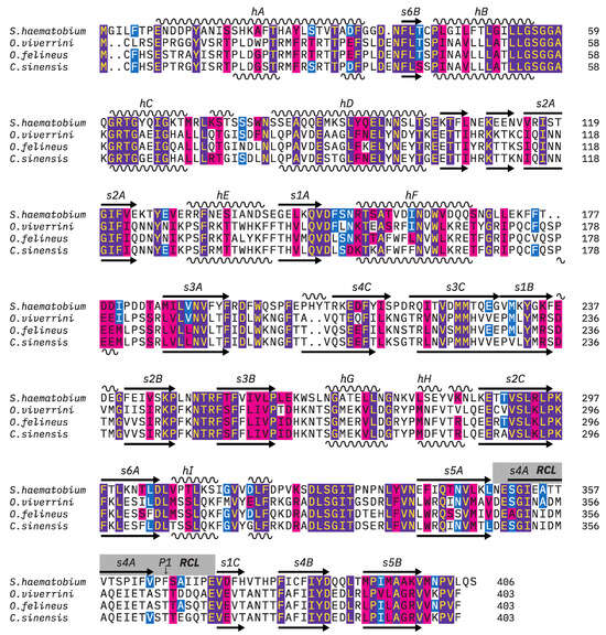 Multiple sequence alignment of S. haematobium SPI (UniProt: Q26502), O. viverrini SIS (UniProt: A0A075AEP2), C. sinensis SIS (UniProt: A0A419PW56), and O. felineus SIS (UniProt: A0A4S2MGE0). The α-helical and β-strand regions of ShSPI and OvSIS based on their AlphaFold native state models [23] are indicated at the top and bottom, respectively. The numbering of the secondary structures follows α1-antitrypsin [24]. The region of the reactive center loop (RCL) with the P1 residue is indicated by a gray bar. Strand 4A in the RCL was manually added as it forms and integrates into β-sheet A after cleavage at P1. Sequence conservation using the BLOSUM 62 similarity matrix and ShSPI as the reference sequence is indicated by color shading (fully conserved: purple background, ≥50% conserved: blue background, and similar: red background). The graphical representation of the aligned sequences was created using TEXshade v1.28 [25].