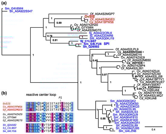 (a) Phylogenetic tree of trematode serpins specified by their UniProt accession numbers. The three previously described serpins of C. sinensis are indicated with a trailing •. Schistosome serpins are shown in blue, with the SPI in bold lettering. OvSIS and its orthologs are shown in red. Opisthorchis/Clonorchis SIS is not orthologous to schistosome SIP. (b) Sequence conservation of the reactive center loop in evolutionarily close serpins (specified by their UniProt accession numbers) in the species O. viverrini (Ov), O. felineus (Of), C. sinensis (Cs), S. haematobium (Sh), S. japonicum (Sj), and S. mansoni (Sm). The P1 position in the protease interaction is indicated. The color shading indicates fully conserved: purple background, ≥50% conserved: blue background, and similar: red background.