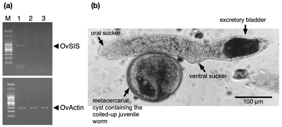 Transcripts of the OvSIS gene (NCBI GenBank Gene: 20320087) were detected by RT-PCR in newly excysted juveniles but not in later juveniles or mature flukes (Figure 4a). Originally, we had cloned the OvSIS cDNA from metacercarial RNA. This suggests that the protein is already produced in metacercariae, and the metacercarial presence of RNA has also been reported in previous analyses of serpins in C. sinensis. All three analyzed C. sinensis serpins showed a wider expression range at the RNA level than OvSIS up to the mature stage but, interestingly, the amounts of RNA of A0A059VDA6 and E2DHH4 were much higher in metacercariae than in the mature fluke [10,12]. It can be assumed that these serpins are required in large amounts during the infection process. Whether they have a redundant function or if they prefer unique serine proteases as targets remains to be determined. Metacercariae and newly excysted juveniles represent the infectious stage of the parasite for its human host. As shown in Figure 4b, these developmental stages are of microscopic size. The excretory bladder is filled with dark pigment granules. In the lung fluke Paragonimus westermani, cysteine proteases were located on these granules and speculated to be released for excystment [28].