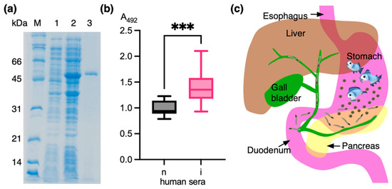 (a) SDS-PAGE showing pre-induced (1) and IPTG-induced bacterial proteins (2) and affinity-purified recombinant OvSIS (3). The protein migrates at the expected 46 kDa molecular weight. (b) Absorption values of two groups of human sera against recombinant OvSIS obtained by indirect ELISA. n: normal sera (n = 10). i: sera of O. viverrini-infected individuals (n = 30). The minimum, 25th percentile, median, 75th percentile, and maximum are indicated in the box plots. The star symbols indicate that all infected sera were statistically significantly different (*** p < 0.05) from the normal sera. (c) Human infection with O. viverrini. The metacercariae are released from infested undercooked fish in the stomach. The acidic environment activates the excystment of the juveniles. The newly excysted juveniles are released with the stomach content into the duodenum and migrate via the sphincter of Oddi into the biliary system (green).