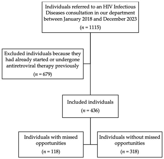 Among the 1115 individuals referred for an HIV Infectious Diseases consultation in our department between January 2018 and December 2023, we included 436 in our study, while 679 were excluded because they had already started or undergone antiretroviral therapy previously (Figure 1). From our sample, 27.1% (118/436) of individuals experienced at least one missed opportunity for HIV diagnosis and were included in the study group. The remaining 72.9% (318/436) were included in the control group.
