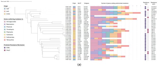 The total number of resistance genes ranged from one (broiler meat isolate) to fourteen (found in pork) (Supplementary Data and Figure 1a). The majority of the isolates were multi-drug resistant (MDR), with the exception of two broiler E. coli. Most common antimicrobial genes coded resistance to the following: tetracyclines (tetA/B, n = 33), sulfonamides (sul2, n = 26), aminoglycosides (aph(6)-Id, n = 21 and aph(3″)-Ib, n = 21) and trimethoprim (dfrA, n = 23). Markers of plasmid-mediated resistance to fluoroquinolones (qnrS1/qnrB19), mostly in pork (n = 5) and less commonly in broiler (n = 2) and beef (n = 1) isolates were also detected. Additionally, one broiler E. coli carried the colistin-resistance gene mcr-1.1. In multiple cases (n = 16), the blaTEM-1B gene, which encodes resistance to beta-lactams, was present in association with cephalosporinase-encoding determinants. In one case, blaTEM-30 was detected—an inhibitor-resistant beta-lactamase. The sequencing data confirmed the presence of various cephalosporin resistance genes across the studied group. The most common were genes coding the ESBL profile: blaCTX-M-1 (n = 15) and blaSHV-12 (n = 9). While blaCTX-M-1 was prevalent across all isolation sources, blaSHV-12 was present exclusively in poultry isolates. Less commonly, E. coli harbored other ESBL markers: blaCTX-M-27 (n = 2), blaCTX-M-14 (n = 1), blaCTX-M-15 (n = 1), blaCTX-M-55 (n = 1). AmpC phenotype was conditioned via blaCMY-2 (n = 7) across all the isolation sources. Sequences of 25 isolates harbored point mutations in the quinolone resistance-determining regions (QRDR) of gyrA (p.S83L and/or p.D87N, n = 25) and parC (p.S80I, n = 13). Six parC + gryA mutants also showed S458A mutation in parE—Supplementary Data. Most strains had at least two point mutations, indicating resistance to both quinolones, such as nalidixic acid, and fluoroquinolones (i.e., ciprofloxacin).