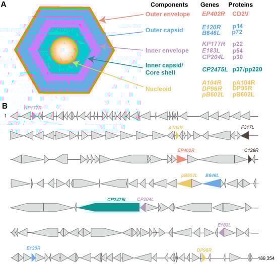 Schematic representation of ASFV structure and location of antigenic epitope-identified proteins in ASFV genomes. (A), Schematic diagram of the ASFV structure. ASFV is composed of an Outer envelope, outer capsid, inner envelope, inner capsid, and nucleoid. (B), Location of antigenic epitope-identified proteins in ASFV genomes.