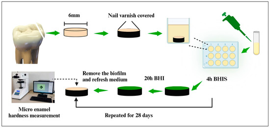According to the approved plan by the Institutional Review Board, human teeth with sound enamel (caries-free) were obtained from dental school clinics [31]. Enamel slabs with a diameter of 6 mm and a thickness of 2 mm were prepared, as illustrated in Figure 1 using BioRender software (Version 2208) [31]. Acid-resistant nail varnish was applied to cover the entire surface area of the enamel slabs, leaving only the enamel surface exposed. The 42 enamel slabs were randomly allocated into 7 groups, with each group containing 6 slabs. A hardness tester (HVS-10Z, Jingbo Company, Hangzhou, Zhejiang, China) equipped with a Vickers indenter, applying a 50 g load for 20 s, was used to make indentations at the center of the enamel surface [31]. Hardness measurements were recorded both before and after the biofilm acid attacks. Sterile enamel specimens were placed in 12-well plates containing 2 mL of S. mutans suspensions at a concentration of 2 × 106 CFU/mL. Each day, the slabs were immersed in 2 mL of BHIS for 4 h at 37 °C with 90% N2 and 10% CO2. The slabs were then transferred to a new plate with sugar-free BHI medium and incubated for 20 h under the same conditions. To prevent biofilm aging and excessive thickening, which could deprive internal bacteria of nutrients, the biofilms were removed daily using sterile paper. The cleaning process was aided by scraping with pipette tips and washing the plates twice with PBS. Paper towels were placed in individually packaged sterile bags and autoclaved to ensure sterility. A new biofilm was then grown on the plate. This cyclic soaking treatment was repeated daily for 28 days to establish the biofilm model.