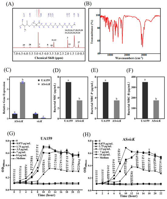 As shown in Figure 2A, the comparison of the 1H-NMR spectra of DMAHDM confirms the identity of the DMAHDM sample. The Fourier Transform Infrared (FT-IR) spectra of DMAHDM displayed characteristic absorption peaks at 1635.08 cm−1 (C=C stretching), 1720.52 cm−1 (C=O stretching), and 2918.15 cm−1 (C-H stretching of saturated hydrocarbons) (Figure 2B). Thus, the identity of the chemical composition of the DMAHDM samples was further confirmed. In addition, UA159 and ASvicK strains were confirmed by qRT-PCR analysis (Figure 2C). The ASvicK strain inhibits the expression of vicK, resulting in a fold change of 0.17.
