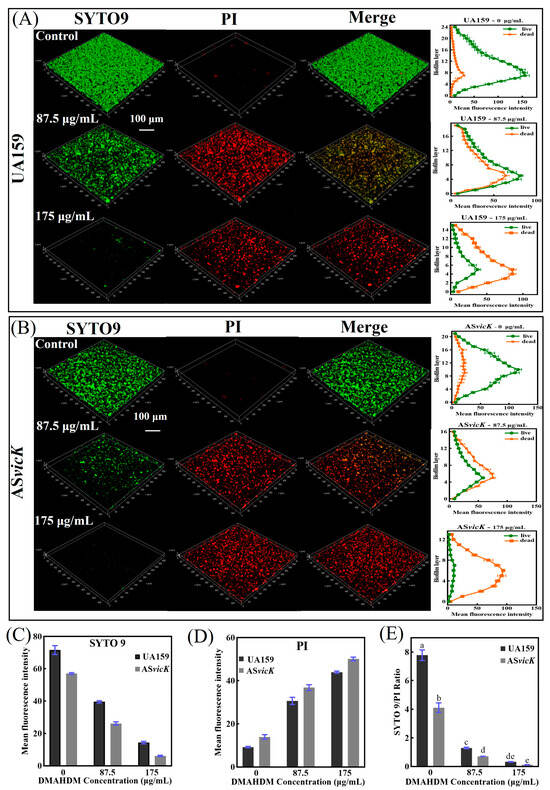 Representative live/dead staining images of preformed biofilms treatment of UA159 and ASvicK strains: (A) Live/Dead staining images and the mean fluorescence intensities for live and dead bacteria in each layer of the UA159 strain (mean ± SD; n = 3); (B) Live/Dead staining images and the mean fluorescence intensities for live and dead bacteria in each layer of the ASvicK strain (mean ± SD; n = 3); (C) Mean fluorescence intensity of SYTO 9 (mean ± SD; n = 3); (D) Mean fluorescence intensity of PI (mean ± SD; n = 3); (E) SYTO 9/PI Ratio (mean ± SD; n = 3); Different letters represent significantly different values (p < 0.05).
