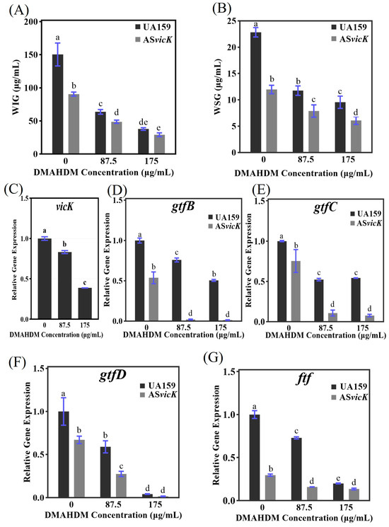 Polysaccharide amounts and gene expression related to EPS metabolism were analyzed. The biofilm was incubated with BHI containing 1% sucrose for 24 h, followed by incubation with BHI containing DMAHDM for an additional 24 h. (A) Production of WIG (mean ± SD; n = 6); (B) Production of WSG (mean ± SD; n = 6); (C–G) Gene expression of vicK, gtfB/C/D and ftf via qRT-PCR (mean ± SD; n = 3). Different letters represent significantly different values (p < 0.05).