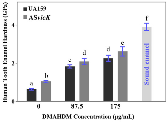 Hardness of human tooth enamel at the surface after a 28-day acid attack by preformed S. mutans biofilms. The biofilms were treated with 87.5 and 175 μg/mL DMAHDM, respectively. The hardness of sound enamel and demineralized enamel was also measured as comparative controls. The hardness test was conducted at the center of the enamel slab. (mean ± SD, n = 6). Different letters represent significantly different values (p < 0.05).
