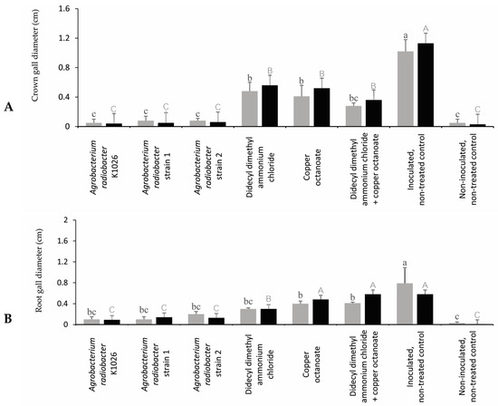 In this study, when the plants were visually monitored for the presence of crown and root galls caused by A. tumefaciens before setting up the experiments, no symptoms were detected. In both trials, the plants were inoculated with the same amount of solution (150 mL/plant) and the same bacterial solution concentration (1 × 109 CFU mL−1). However, we observed crown and root galls on non-inoculated, non-treated control plants at the end of the experiments. It might be possible that the pathogen could be in the plant even if no symptoms were observed with the visual assessment of the plants. That can be a reason to observe gall formation caused by A. tumefaciens on non-inoculated, non-treated control plants. Additionally, it can explain the higher number of crown and root galls and diameters in the treated plants compared to the control plants, and the difference between trials 1 and 2. This suggests that using molecular tools to detect the pathogen can be more reliable before setting up the study for future experiments.