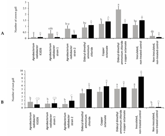 The effect of the treatments on the root gall diameter to the root diameter (RGD/RD) ratio. Means followed by different lowercase (trial 1, representing the gray color) and uppercase (trial 2, representing the black color) letters above the bar represent significant differences (n = 10, p ≤ 0.05, one-way ANOVA with post hoc Fisher’s test with an α = 0.05).