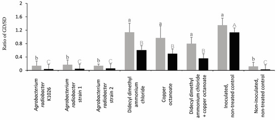 In trial 1, the plants treated with the A. radiobacter strain K1026 and A. radiobacter strains 1 and 2 resulted in a significant reduction in the GD/SD ratio compared to the didecyl dimethyl ammonium chloride, copper octanoate, didecyl dimethyl ammonium chloride + copper octanoate, and the inoculated, non-treated control (Figure 6). In trial 2, all of the treatments significantly reduced the GD/SD ratio compared to the inoculated, non-treated control (Figure 6, Supplementary Figure S1).