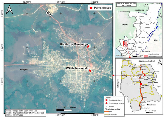 Mossendjo is the second city of the Niari Department after Dolisie. It is located in the south of the Republic of the Congo, 487 km from Brazzaville, in the heart of the Chaillu massif, full of mountain and forest chains, extending over an area of 5200 km2. Mossendjo is a semiurban community with approximately 13,000 inhabitants, mainly living from agricultural activities and hunting. It is divided into two districts. Patient recruitment, blood collections, and thick blood smear examinations were performed at the Centre de Santé Intégré-Poste (CSIMSJ) located in district 1, namely, Bouali, and the Hôpital de Base (HBMSJ) located in district 2, called Itsibou (Figure 1).