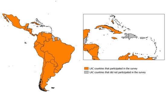 The survey questionnaire was answered by 54 professionals from 26 LAC countries: Anguilla, Argentina, Aruba, the Bahamas, Bermuda, Bolivia, Brazil, the British Virgin Islands, Chile, Colombia, Costa Rica, Cuba, Ecuador, El Salvador, Guatemala, Honduras, Jamaica, México, Nicaragua, Panamá, Paraguay, Perú, Suriname, the Turks and Caicos Islands, Uruguay, and Venezuela. Once the exclusion criteria were applied, a total of 35 questionnaires from 17 countries were analyzed (Figure 1). Sensitive data regarding professionals, institutions, and countries in the survey questionnaires were not disclosed in statistical analysis or data presentation. The survey respondents were professionals in charge of zoonosis and food safety programs at their countries. In other words, they were decision makers at the national level who understood the situation in their countries. Despite the apparently small sample size, the value of the answers is considered of great significance.