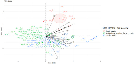 PERMANOVA indicated significant differences between the OH thematic groups or parameters (Table 3). The PCA of health parameters in LAC as a function of countries’ perceptions (self-vectors) showed that food safety and public policies were evaluated better than institutional routines for zoonosis (Figure 2).