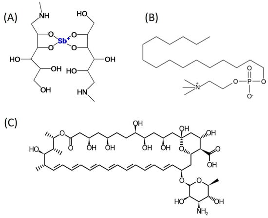Chemical structure of MA (A), miltefosine (B), and AmB (C).