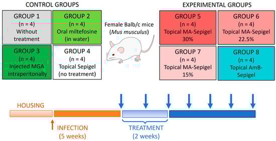Female BALB/c mice (5–7 weeks old, weighing approximately 20 g) were infected at the base of the tail with 1 × 106 stationary-phase L. amazonensis promastigotes in 50 µL of physiological saline solution. After a 5-week infection period, the mice underwent a 2-week daily treatment regimen. They received 50 µL of the various Sepigel formulations topically, covering the entire lesion/ulcer/inflammation. These included formulations with 15%, 22.5%, and 30% MA, just Sepigel, or AmB-Sepigel. Mice treated orally with miltefosine received the drug dissolved in their drinking water, with the dosage adjusted based on average water intake and the mice’s weight [17]. Mice treated with MA by intraperitoneal injection received 120 mg/kg/day. Given the average weight of the mice was 25 mg, the dosage was 3 mg/day per mouse, administered with insulin syringes of 0.3 mm diameter [18]. Lesion development was monitored weekly using a caliper, and lesion size was calculated by measuring the thickness and length. One month after the treatment concluded, the mice were sacrificed, and tissue samples from the skin (lesion) and liver were collected for parasite quantification. The scheme carried out in the in vivo study is shown in Figure 2.