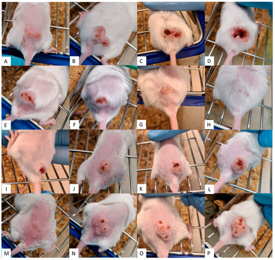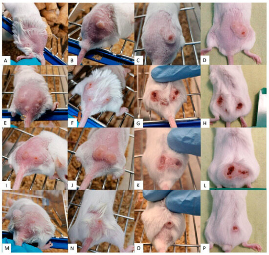 In contrast, Figure 3 and Figure 4 showed that the lesion growth rate slowed significantly over the course of the Sepigel-based treatments, particularly two weeks post-treatment (Figure 4C,G,K,O). Notably, the mice treated with the highest concentration of MA exhibited the most pronounced response (Figure 4I–L). The AmB treatment (Figure 4M–P) also significantly reduced lesion size compared to untreated mice (Figure 3A–D), displaying even better results than those treated with MA-Sepigel (Figure 4D,H,L) four weeks post-treatment.