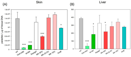 Skin and liver parasite burden in BALB/c mice from control and experimental groups. The number of L. amazonensis was quantified using qPCR from tissue of (A) skin (lesion edge) and (B) liver tissue from the different groups of mice at week 4 after the end of treatment. w/t: without treatment; Oral milte: oral miltefosine; Inj MA: intraperitoneally injected MA; MA: meglumine antimoniate in Sepigel; AmB: amphotericin B in Sepigel. N = 4. * p < 0.05; *** p < 0.001.