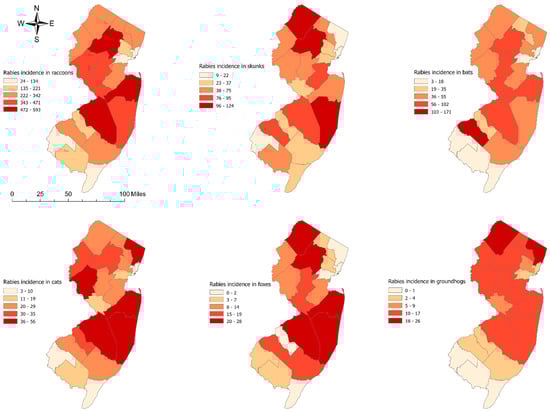 A total of 9637 rabies cases were analyzed, including raccoons (n = 6308), skunks (n = 1225), bats (n = 1072), cats (n = 597), foxes (n = 225), and groundhogs (n = 210). The median rabies incidence varied by animal species across the New Jersey counties. For instance, the median rabies incidence in each county was highest in raccoons (median = 254; range: 24–593), followed by skunks (median = 59; range: 9–124), bats (median = 45; range: 3–17), cats (median = 26, range: 3–56), foxes (median = 10; range: 0–28), and groundhogs (median = 12; range: 0–26). Rabies incidence also varied geographically. In raccoons, for example, higher numbers of rabies cases tended to occur in the northern and eastern regions of New Jersey, while the lowest number of rabies cases was observed in the south (Figure 1).