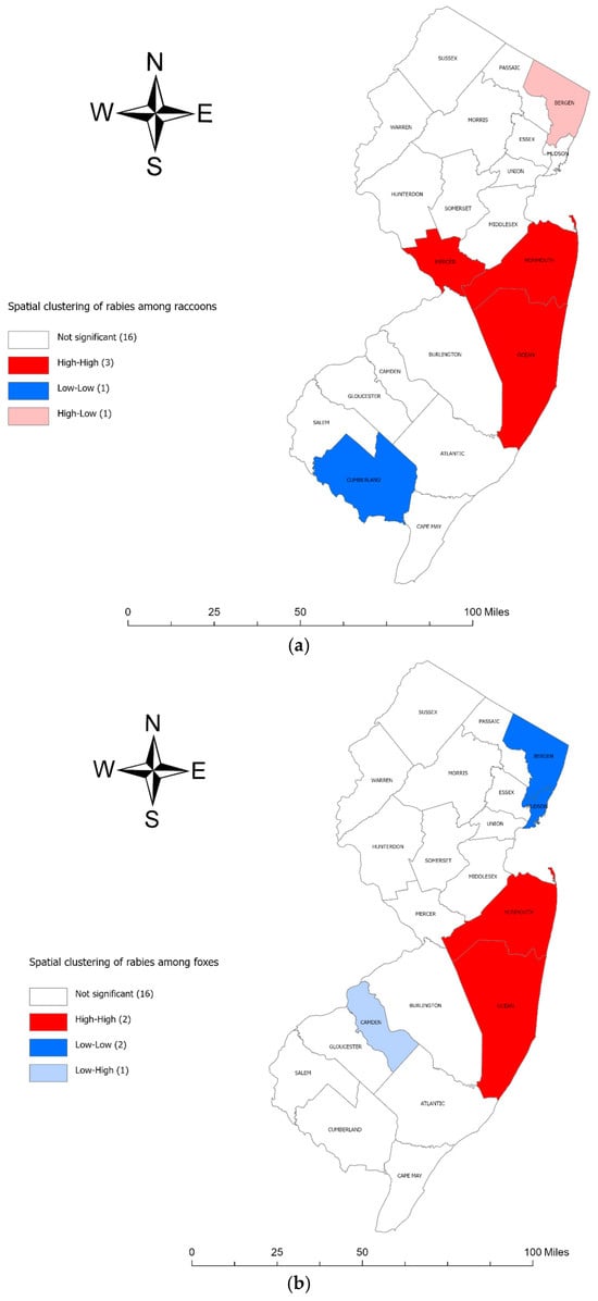 To our knowledge, this is the first study to investigate the spatial patterns and clusters of rabies in animals at the county level in New Jersey using spatial epidemiologic methods. The identified spatial clusters will be helpful for guiding health intervention planning and policy. Approximately 55,000 people are also administered PEP annually, resulting in over USD 200 million in healthcare costs in the U.S. []. Economic analyses by the WS indicate that preventing the spread of raccoon rabies in the western U.S. alone could reduce PEP costs by as much as USD 50 million annually []. The CDC noted that maintaining animal rabies prevention systems in the U.S. costs over USD 500 million annually []. Although the annual number of human rabies cases in the U.S. is relatively low (only 1–3 cases occur each year), the primary objective of targeted rabies vaccination in wild animals is to protect domestic animals and humans and minimize the economic burden associated with PEP, pet quarantine, and livestock losses []. Our study identified spatial clusters of rabies cases in wild animals that can aid in devising a targeted strategy for rabies vaccination in wild animals that optimizes resource allocation and minimizes costs. Targeted oral rabies vaccination programs for wildlife in areas with high-risk spatial clusters can be cost-efficient, with cost–benefit ratios greater than 1.0 []. However, this study is not without limitations. We were unable to analyze potential predictors associated with the areas with the highest risk (statistically significant clusters) of rabies in New Jersey due to a lack of data. Identification of localized rabies clusters could help guide future studies targeting significant rabies clusters (hotspots) and may help refine the results to improve our understanding of the contextual and geographical factors (land use type, land elevation, major roads, rivers/lakes, low-intensity residential areas, and oral rabies vaccination exposure) [] that are associated with rabies clusters. Additionally, spatial clustering patterns can reveal areas where multiple rabies-carrying species coexist. These areas pose a higher risk of spillover to domestic animals and humans. Identifying these zones allows for targeted public education and mitigation strategies. By understanding the spatial distribution of rabies risk, public health agencies can allocate resources (vaccines and personnel) more efficiently. This includes enhanced public awareness campaigns to educate residents in hotspot areas about rabies prevention. Additionally, control strategies like wildlife population reduction might be considered in high-risk areas, but only if necessary and in accordance with responsible wildlife management practices. We were also limited in our ability to look at smaller geographic areas and shorter periods of time due to the small number of rabies cases. Therefore, our results may be limited by the modifiable area unit problem []. In addition, we acknowledge that analyzing the genetic evolution of wildlife rabies virus strains would be valuable and would provide additional insights into the epidemiology of rabies in New Jersey. While we were not able to include genetic analysis in this study, we believe it will be a key area for investigation in future research. A genetic analysis of wildlife rabies virus strains could help identify the sources and variations of rabies virus strains and their transmission patterns in this region, contributing to more effective control measures across different spatial scales [,].