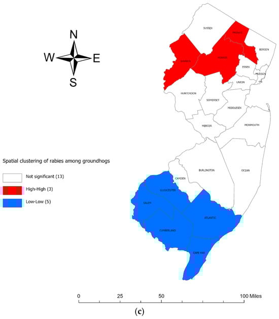 Likewise, northern New Jersey counties (Passaic, Morris, and Warren) exhibited a significant high-risk spatial cluster of rabies in groundhogs during the study period. These counties, characterized by a mix of urban, suburban, and rural environments, provide suitable habitats for the groundhog population. Previous research indicated that northeastern and mid-Atlantic states have reported the most rabies cases in groundhogs [], and rabid groundhogs were clustered in the U.S. counties where raccoon rabies was enzootic [,]. Our findings revealed a distinct spatial pattern, with rabid groundhogs clustered in northern New Jersey (Figure 2c) and rabid raccoons clustered in southeastern New Jersey (Figure 2a).