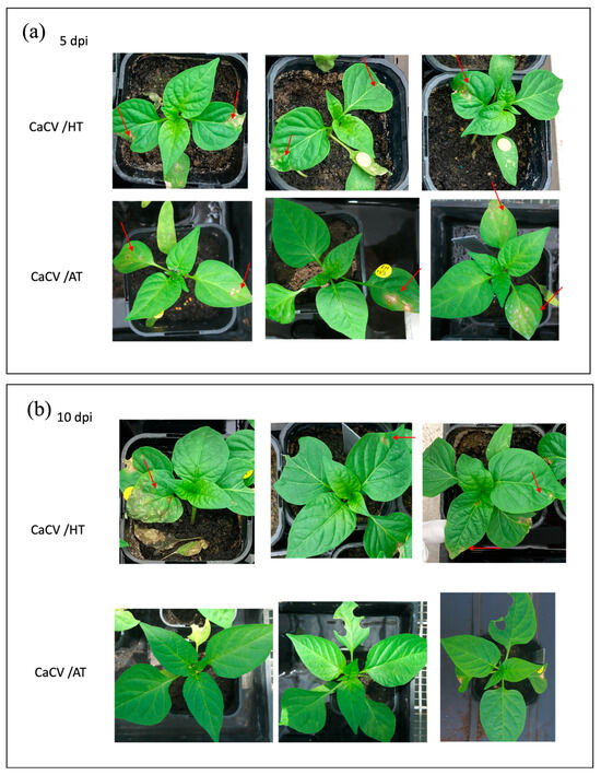 Effect of elevated temperature on capsicum chlorosis virus (CaCV) infection in CaCV-resistant capsicum plants: (a) at 5 days post inoculation (dpi), a hypersensitive response (red arrows) was apparent in CaCV-inoculated leaves of capsicum plants grown at high temperature (HT) of 35 °C and ambient temperature (AT) of 25 °C; (b) at 10 dpi, necrotic spots (indicated by red arrows) were apparent on systemic leaves of some capsicum plants grown at HT but not on any plants grown at AT. Three representative plants are shown for each treatment.