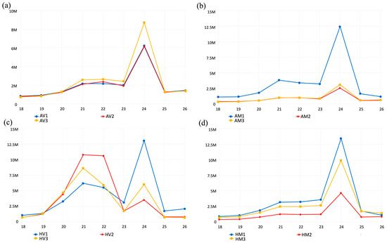 Small RNA length distribution of 18-nucleotide to 26-nucleotide (million (M) reads) in 12 small RNA libraries. Each diagram represents three independent libraries constructed from samples collected from (a) capsicum chlorosis virus (CaCV)-inoculated plants grown at ambient temperature (AV), (b) mock-inoculated plants grown at ambient temperature (AM), (c) CaCV-inoculated plants grown at higher temperature (HV), and (d) mock-inoculated plants grown at higher temperature (HM).