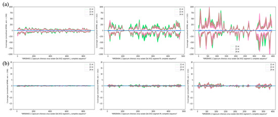 Profiles of capsicum chlorosis virus (CaCV)-derived viral siRNAs. The 21-, 22-, and 24-nucleotide vsiRNA coverage across the CaCV genome L, M, and S segments in CaCV-infected capsicum plants grown at (a) higher temperature (HV), and (b) ambient temperature (AV). Standard error of 3 biological replicates is presented as the smoothed plots. The reads-per-million (RPM) scale is set at ±1000 for three datasets of the HV treatment and at ±20 for three datasets of the AV treatment.