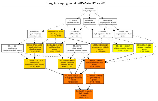 Acyclic graph showing hierarchical relationship of the enriched gene ontology (GO) terms associated with targets predicted from upregulated miRNAs in CaCV-infected capsicum grown at high temperature (HV) compared to ambient temperature (AV) in the biological process category. The color scale from yellow to red indicates an increasingly significant enrichment of GO terms.